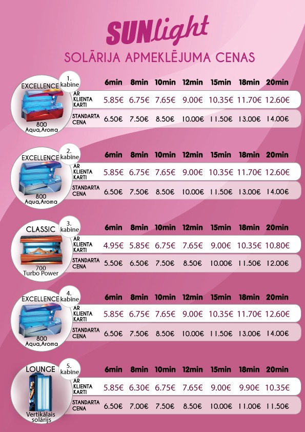 Daži solāriji piedāvā iespēju pielāgot UV staru intensitāti. Mūsu personāls palīdzēs izvēlēties piemērotāko režīmu jūsu ādas tipam.
